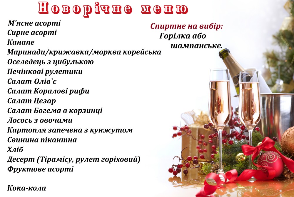 Зустріньте НОВИЙ РІК весело та яскраво у ресторані "Сьоме небо" Святкуйте Новий Рік з нами! На Вас очікує оригінальна розважальна програма з цікавими конкурсами, веселими іграми, танцями, розіграшами призів, яка подарує незабутні приємні враження, теплу атмосферу дружньої компанії та чудові спогади!!! Лише у нас два незалежних танцполи. У верхньому залі розважатиме гостей жива музика з різноманітним репертуаром і казковим світловим оформленням,а у нижньому залі порадує запальною дискотекою досвідчений DJ, і все це одночасно, і все це до 6:00 ранку!!! Прикрасять Новорічну ніч холодні вогняні фонтани і вишуканий бенкет який вдовольнить смаки найвибагливіших гурманів. Меню (на 2 особи): М'ясне асорті Сирне асорті Канапе Маринади/крижавка/морква корейська Оселедець з цибулькою Печінкові рулетики Салат «Олів`є» Салат Коралові рифи Салат Цезар Салат Богема в корзинці Лосось з овочами Картопля запечена з кунжутом Свинина пікантна Хліб Кока-кола Горілка/шампанське Десерт (Тірамісу, рулет горіховий) Фруктове асорті Для замовлення столиків: +38 (097) 344 66 00 +38 (063) 93 000 39 +38 (032) 297 95 73 адреса ресторану: смт.Рудно, вул.В.Великого 3б | |